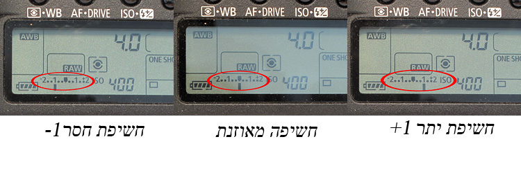 למשל, להקטין ISO, לפתוח צמצם, לבטל את פעולת הפלאש. לאחר כל שינוי, תחשב המצלמה מחדש את הערכים הנדרשים לחשיפה מאוזנת, בהתחשב בשינוי.