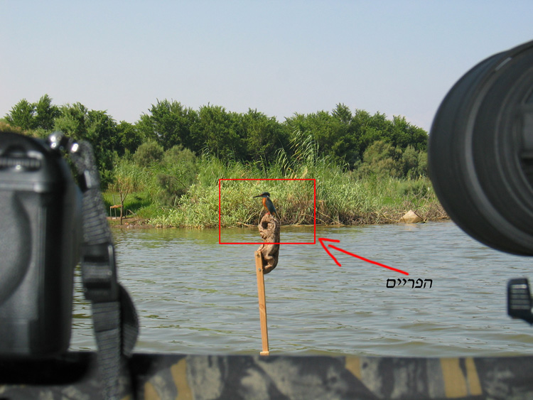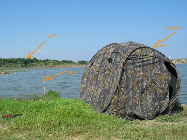 נמקם את המסתור (האוהל המתקפל שקנינו ב150 ₪ בהום סנטר…) ליד שפת המים, נציב ענף או מקל בתוך המים, זאת על מנת לייצר עבור הדוגמן הפוטנציאלי עמדת צייד נחשקת. מיקום האוהל חייב להיעשות בתאום עם כיוון תאורת השמש בשעת הצילום. נקפיד שהשמש תהיה בגבנו, כך שהאור יהיה לכיוון הענף. את הענף נמקם במרחק של מספר מטרים מהמסתור. המרחק הספציפי תלוי באורך המוקד של העדשה איתה מצלמים. המרחק הזה יקבע מה יהיה גודלו של השלדגון בפריים הסופי. יותר מכך, נשתדל לבחור ענף מרשים ומיוחד שיצטלם היטב ולא יהיה סתמי או מלאכותי.